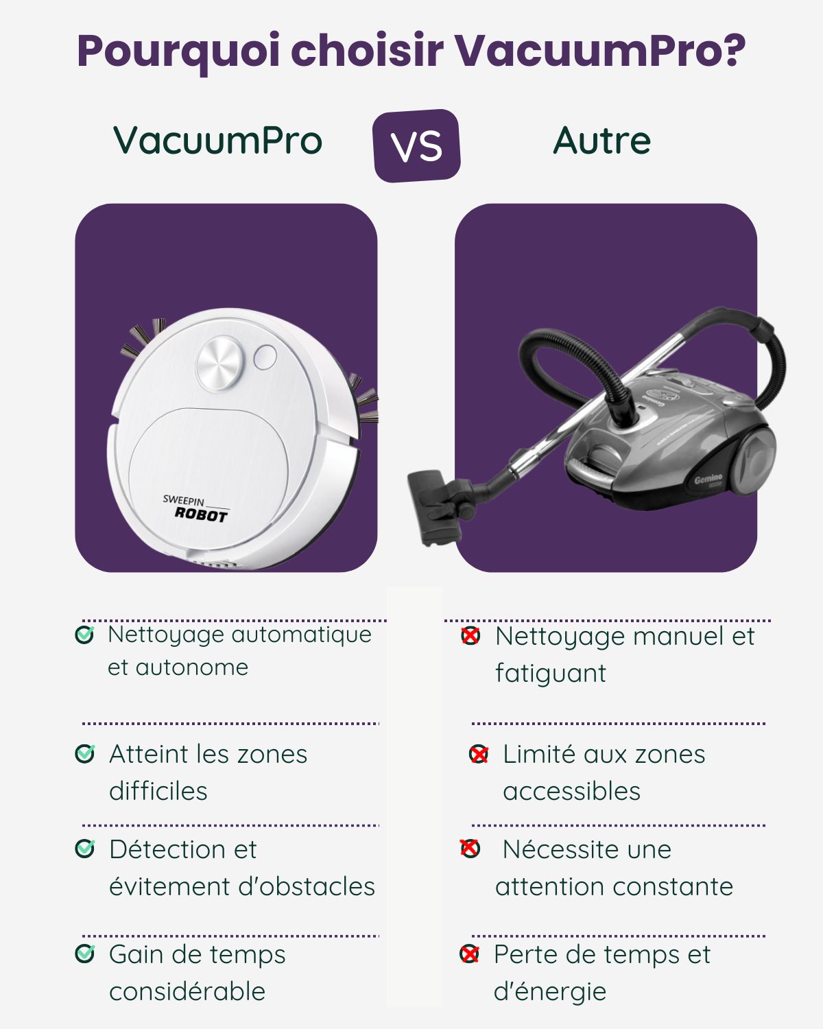 Imaginez rentrer chez vous après une longue journée et trouver vos sols brillants, sans avoir levé le petit doigt. C'est la promesse du VacuumPro. Ce mini-aspirateur robot a été conçu pour simplifier votre vie. Il se faufile partout, sous les meubles et dans les recoins, et nettoie en profondeur pour vous libérer du temps et de l'énergie. Il est la solution parfaite pour maintenir votre maison propre au quotidien.